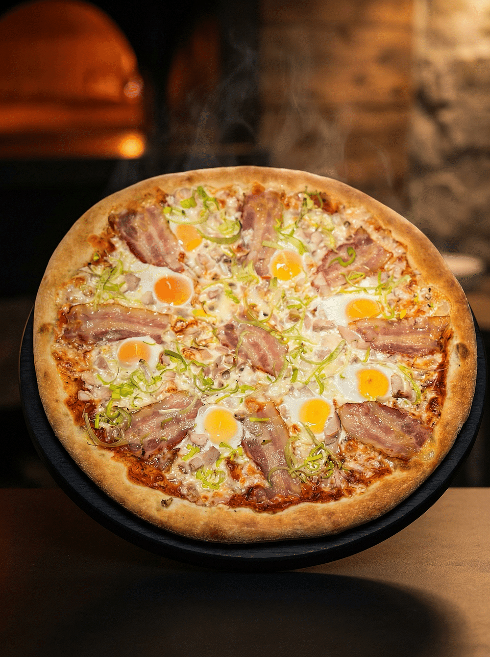 Томатный соус, моцарелла, свежие томаты, бекон, куриное филе, перепелиные яйца, лук порей