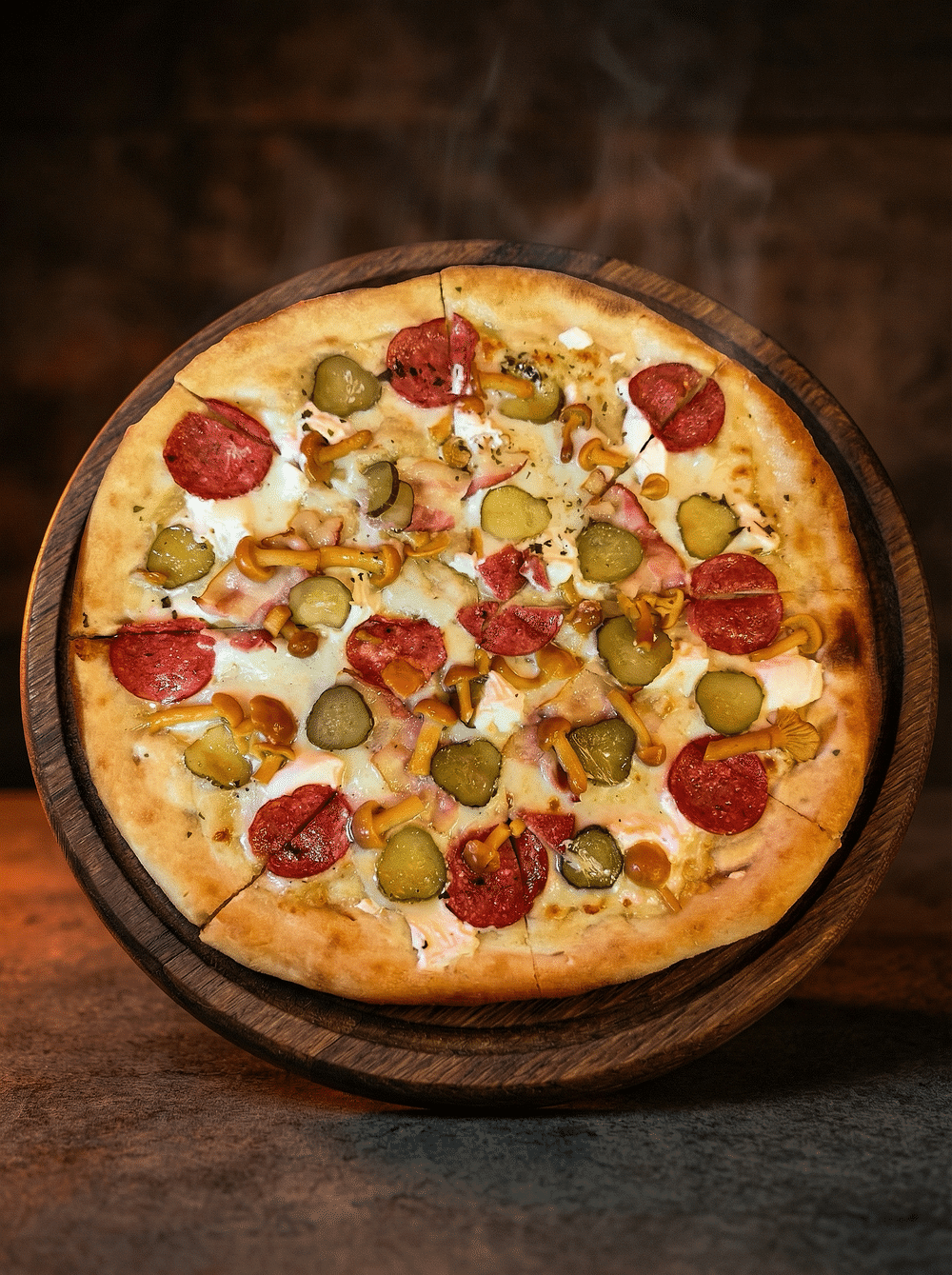 Белый сливочный соус, сыр моцарелла, сыр кремчиз, бекон, салями, маринованные опята, маринованные огурчики