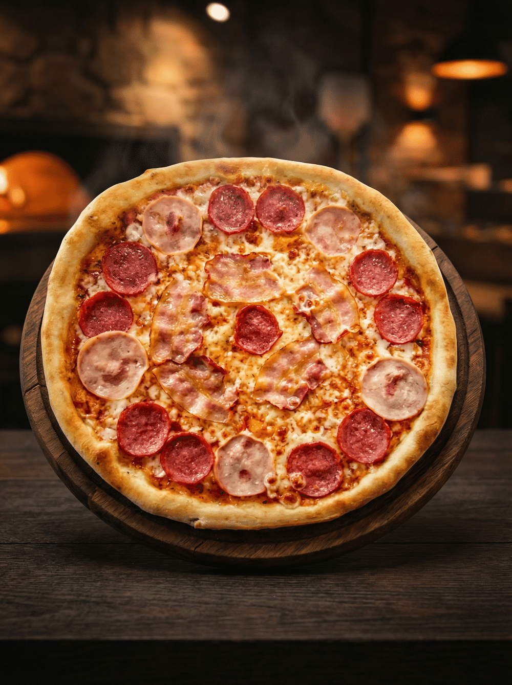 Томатный соус, моцарелла, ветчина, бекон, салями