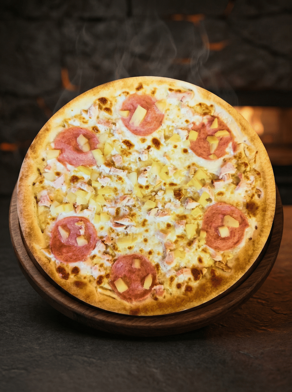 Белый сливочный соус, сыр моцарелла, ветчина, ананас, куриное филе
